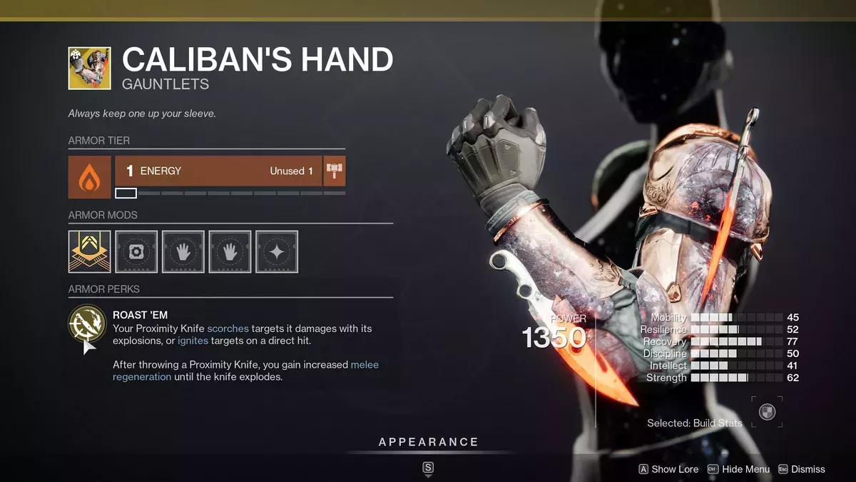 La Mano de Calibán aumenta los Cazadores Solares. Su pericia exótica es Roast 'Em, que hace que los cuchillos de proximidad calcinen a los objetivos con daño por salpicadura o se enciendan en un impacto directo. Lanzar el cuchillo sin que explote ofrece una mayor regeneración del arma.