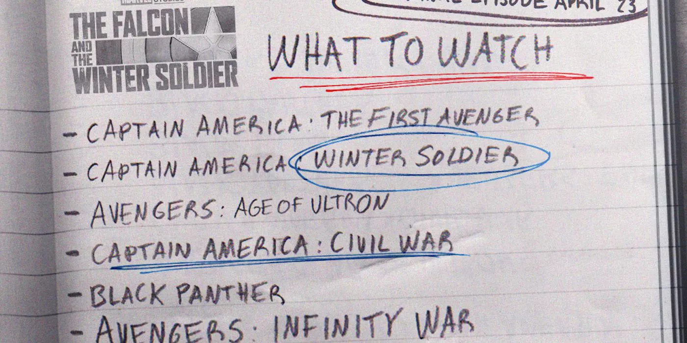 La cuenta oficial de Twitter de la serie compartió una lista de seguimiento de los grandes éxitos de Bucky, Sam y el resto del reparto del Universo Cinematográfico de Marvel (MCU). Esto incluye Capitán América: El primer vengador, Capitán América: El Soldado de Invierno, Vengadores: La era de Ultrón, Capitán América: Civil War, Pantera Negra, Vengadores: Infinity War, Vengadores: Endgame y, por supuesto, los cinco primeros episodios de El Halcón y El Soldado de Invierno. La lista también incluye episodios de Marvel Studios: Legends que se centran en Sam, Bucky, Zemo y Sharon Carter.