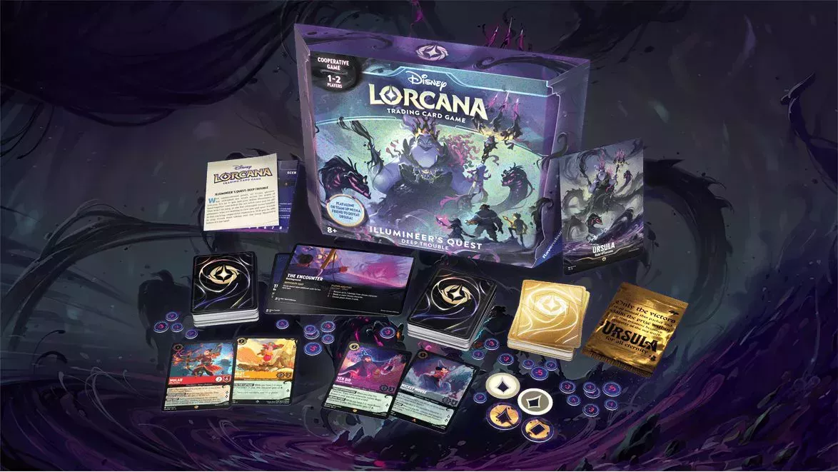 La caja contiene un mazo de escenario de 50 cartas, junto con un par de mazos preconstruidos para ti y un amigo. También encontrarás una carta de Úrsula de gran tamaño junto con dos cartas de campo de batalla de doble cara, además de un tapete de juego y un montón de fichas. Ten en cuenta que, aunque la caja incluye las reglas necesarias para jugar en el nuevo modo cooperativo, no incluye las reglas de la versión PvP, aunque Ravenburger ofrece varios tutoriales gratuitos en su página web.