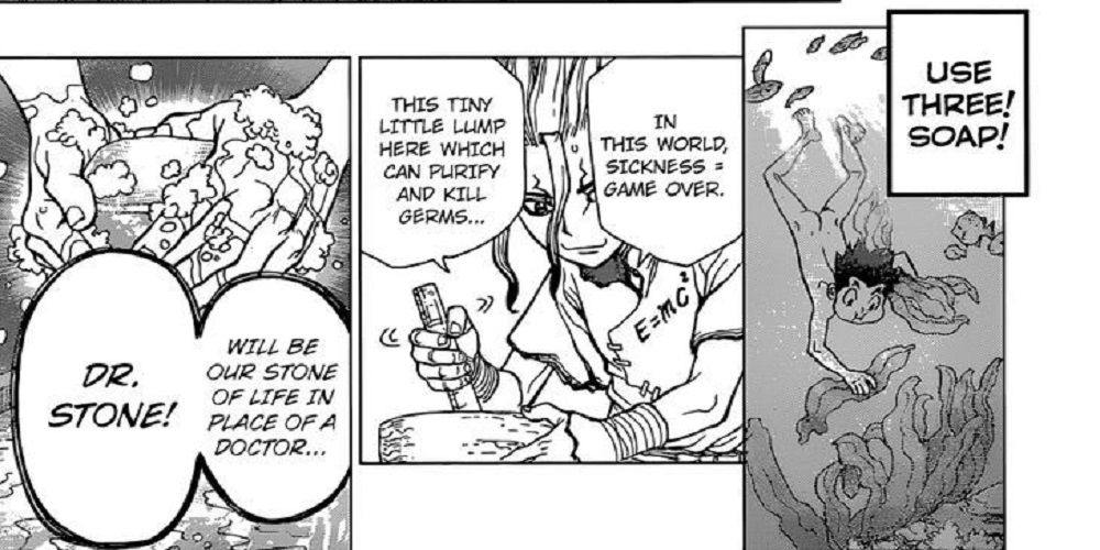 Un invento bastante básico, pero uno de los más importantes que se podrían haber introducido. El jabón es necesario para la higiene básica. Por ello, no es de extrañar que Senku lo introdujera entre sus amigos al principio de la serie. Sin embargo, cabe mencionar que, aparentemente, la aldea Ishigami no lo tenía hasta que Senku se lo introdujo, lo que plantea preguntas sobre cómo debían oler antes de que Senku se uniera a ellos.