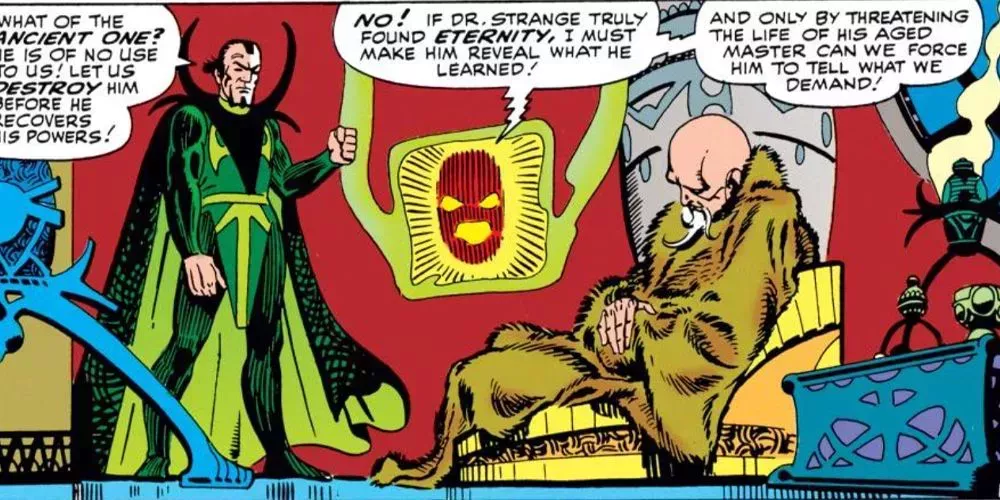 Mordo comienza su andadura en los cómics en el número 111 de Strange Tales , de Stan Lee y Steve Ditko, con un plan para acabar con el Anciano. Tomando posesión de un asistente mediante una proyección astral, Mordo envenena la comida del Anciano e intenta interrogar al místico. Mordo le amenaza con una muerte lenta y atroz provocada por el veneno, pero es interrumpido por su persistente rival: la forma astral del Doctor Extraño. Se produce una breve refriega, pero se resuelve cuando el abnegado Strange cede su poder al Antiguo y asusta a Mordo para que vuelva a su propio cuerpo. En consecuencia, el ayudante vuelve a la normalidad y el Anciano se salva, aunque su casi muerte a manos de un alumno sin duda influye en su selección de estudiantes en el futuro.