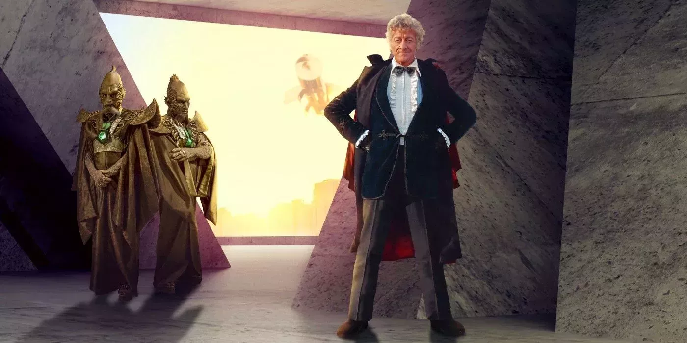 Teniendo en cuenta que el Tercer Doctor de Jon Pertwee tuvo que robar su traje de un hospital, nadie puede culparle por el extraño pero sorprendentemente elegante conjunto. Compuesto por una camisa blanca con volantes, un abrigo de terciopelo negro con pajarita y una capa negra con entradas rojas, el traje del Tercer Doctor le da un aspecto moderno, dramático y formal.
