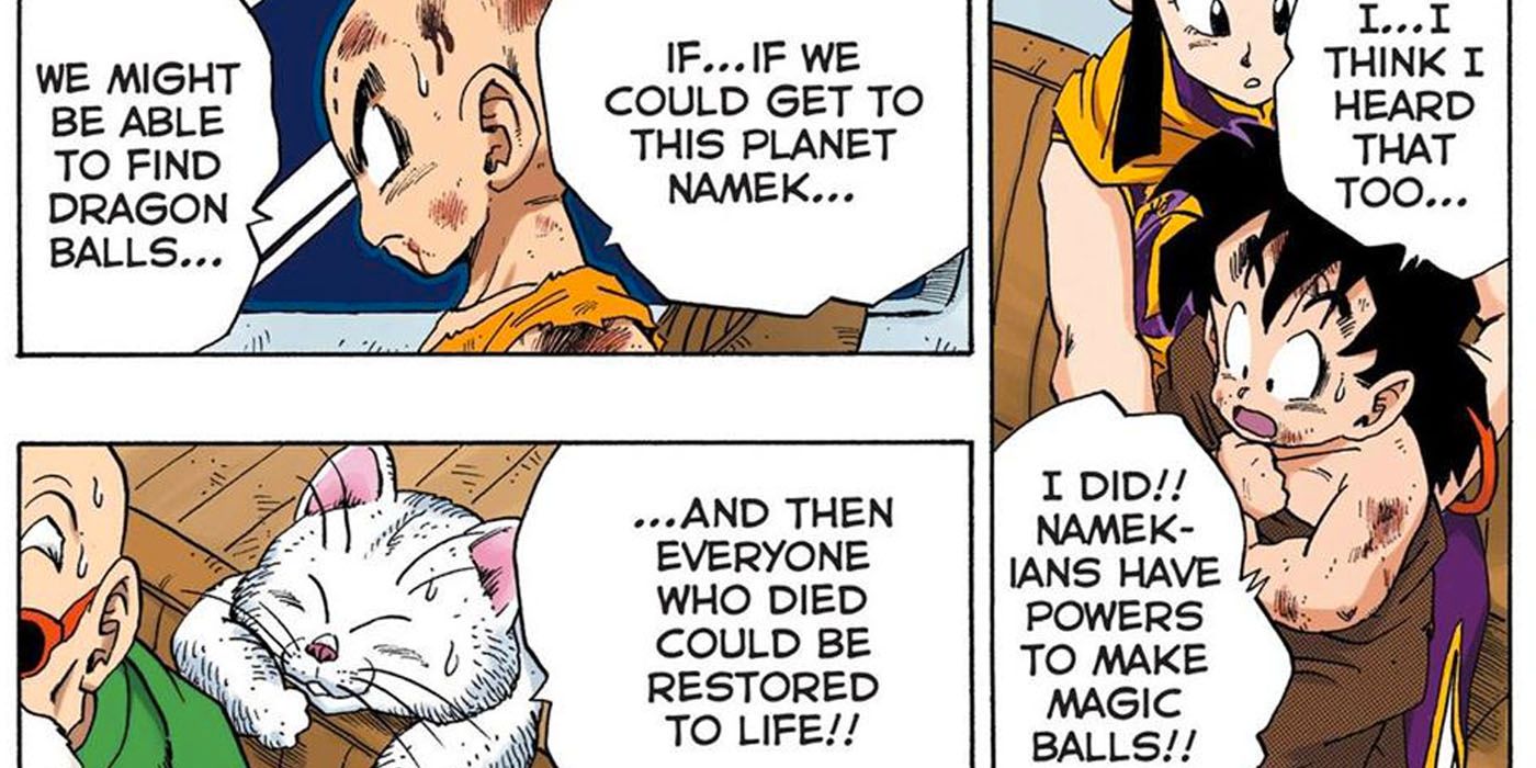 Es raro que Bola de Dragón sea tan autorreflexiva, pero también es muy importante. Krillin razona que debería haber Bolas de Dragón en el mundo natal de Piccolo, Namek. Cuando los protagonistas se sentían desesperados tras una pelea que técnicamente habían ganado, ahora tenían la oportunidad de devolver a la vida a sus amigos muertos.