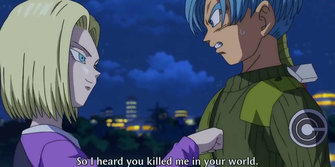 Trunks se hace eco de este sentimiento durante su visita al pasado, donde se entera de que Krillin se casó con la Androide 18 después de los sucesos de la Saga de Célula, aunque Trunks casi no permitió que Krillin lo explicara, ya que favoreció su espada en el momento en que vio a 18. Si lo hubiera desenfundado, podría haber descuartizado a la androide mientras su hija colgaba de su espalda. Tiene que aprender a hablar las cosas primero.