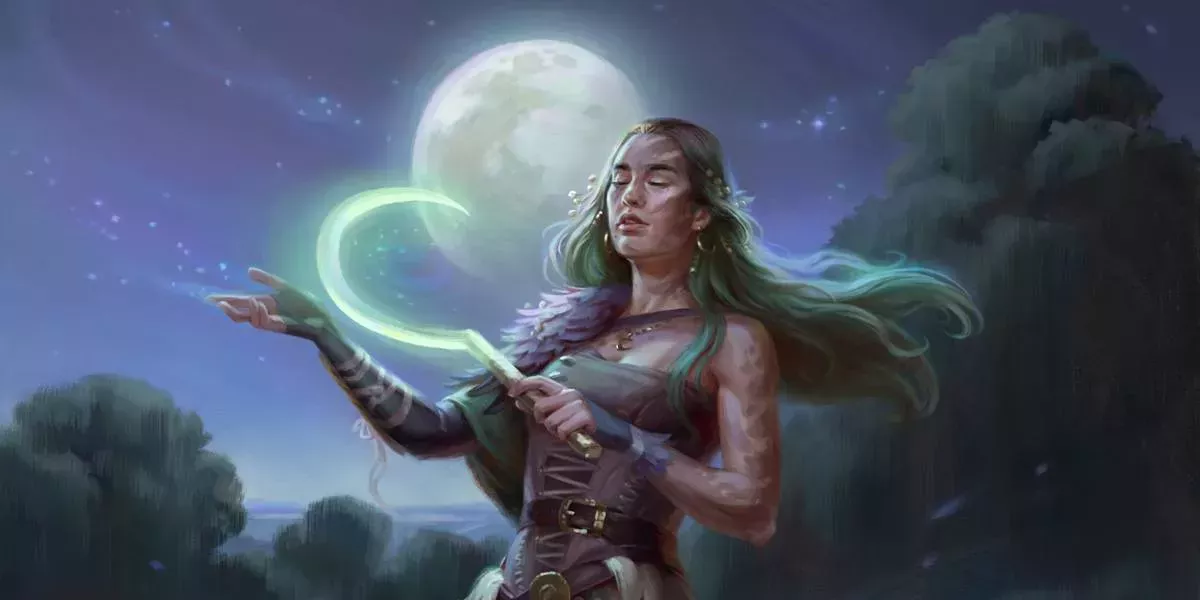 Los druidas del Círculo de la Luna se reúnen por la noche, donde intercambian noticias y advertencias destinadas a mantenerse a salvo unos a otros y a sus tierras. Son raramente vistos, incluso por otros druidas, ya que prefieren vivir vidas solitarias en sus formas animales. Los druidas lunares conectan con el mundo primigenio y pueden lanzar Forma salvaje como acción adicional, en lugar de como acción. También obtienen acceso a animales más poderosos que los druidas de los otros círculos. Esto significa que la subclase del Círculo de la Luna es ideal para los jugadores que quieren ir a por todas en la habilidad Forma salvaje en lugar de confiar en el lanzamiento de hechizos. Por ejemplo, un jugador puede sentir que la clase druida es redundante con clérigos y guardabosques en términos de lanzamiento de hechizos, por lo que puede centrarse más en la Forma salvaje para sentirse distinto y especial en el grupo.