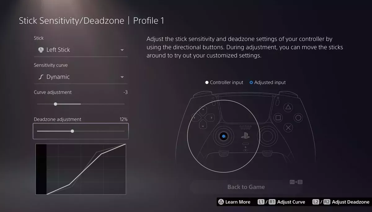 También incluye amplios menús de software en la interfaz de PS5 que te permiten ajustar aspectos como la sensibilidad del stick analógico y las zonas muertas, lo que te da control sobre diferentes tipos de velocidades del stick para adaptarse mejor a diferentes estilos de juego. Y esas opciones se basan en un sistema de perfiles personalizados, para que puedas pasar rápidamente de un estilo de juego a otro o de un juego a otro y mantener tus ajustes precisos listos en cualquier momento.