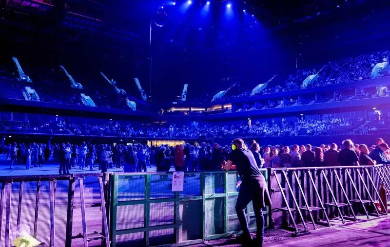 Por la mañana, antes de que se celebrara el concierto, se informó de que decenas de obreros con chalecos reflectantes y cascos seguían trabajando en Co-Op Live y sus alrededores.