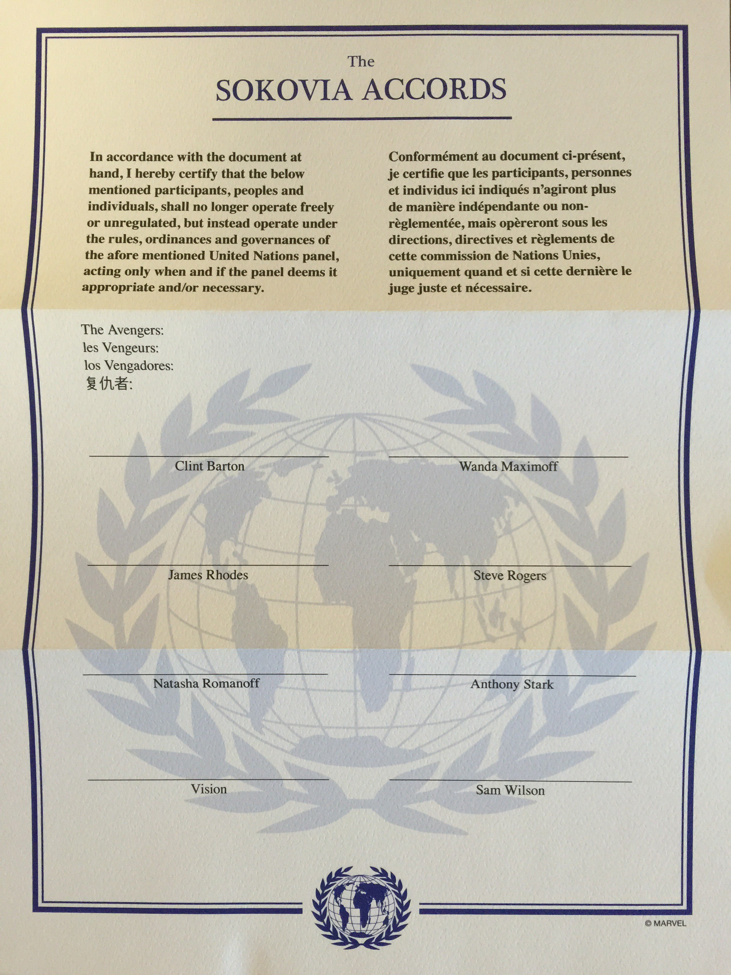 El llamado Acuerdo de Sokovia, que supondrá una parte fundamental del conflicto entre Iron Man y Capitán América en Civil War, ya han sido presentados de manera oficial Marvel.
