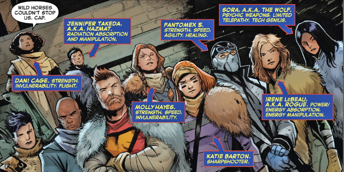 A pesar de ser una distopía sombría, el futuro en el que se encuentra la Capitán Maravilla durante la actual historia de su serie ofrece un atisbo de esperanza de que los mutantes se aislarán menos en el futuro. En Captain Mar vel #23 Carol dirige a un equipo de futuros héroes a un enfrentamiento con la misteriosa Ove. Entre ellos están Emma Frost, la hija de Rogue y Gambit, la hija de Forge y Kwannon, y un ser llamado Fantomex 5, que trabaja codo con codo con los hijos de héroes no mutantes como Dani Cage y la hija de Thor. Carol pide al grupo que le expliquen cómo resultó el mundo y le cuentan de dos guerras con un enemigo del que aún saben poco pero del que sospechan que puede ser un alienígena. Describen que los X-Men trabajan con los otros héroes de la Tierra para luchar por el planeta y las imágenes de flashback muestran a Cíclope, Tormenta, Pícaro, Armadura y otros involucrados en las batallas. Está implícito que la mayoría de los personajes que no aparecen en las escenas futuras murieron en los conflictos. Magneto se sacrificó para construir el santuario subterráneo donde vive la resistencia.