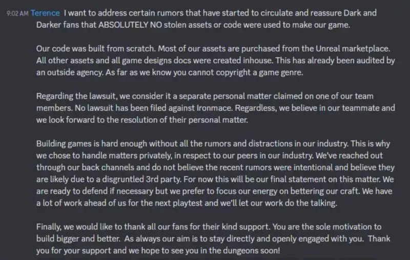 Ironmace, cuyos antiguos empleados de Nexon también han sido acusados de intentar robar otros códigos, recursos y documentos de desarrollo de Nexon, continuó en la declaración en Discord: "La mayoría de nuestros activos se compran en el mercado de Unreal. El resto de activos y todos los documentos de diseño del juego se crearon internamente. Esto ya ha sido auditado por una agencia externa. Por lo que sabemos, no se pueden registrar los derechos de autor de un género de juego".
