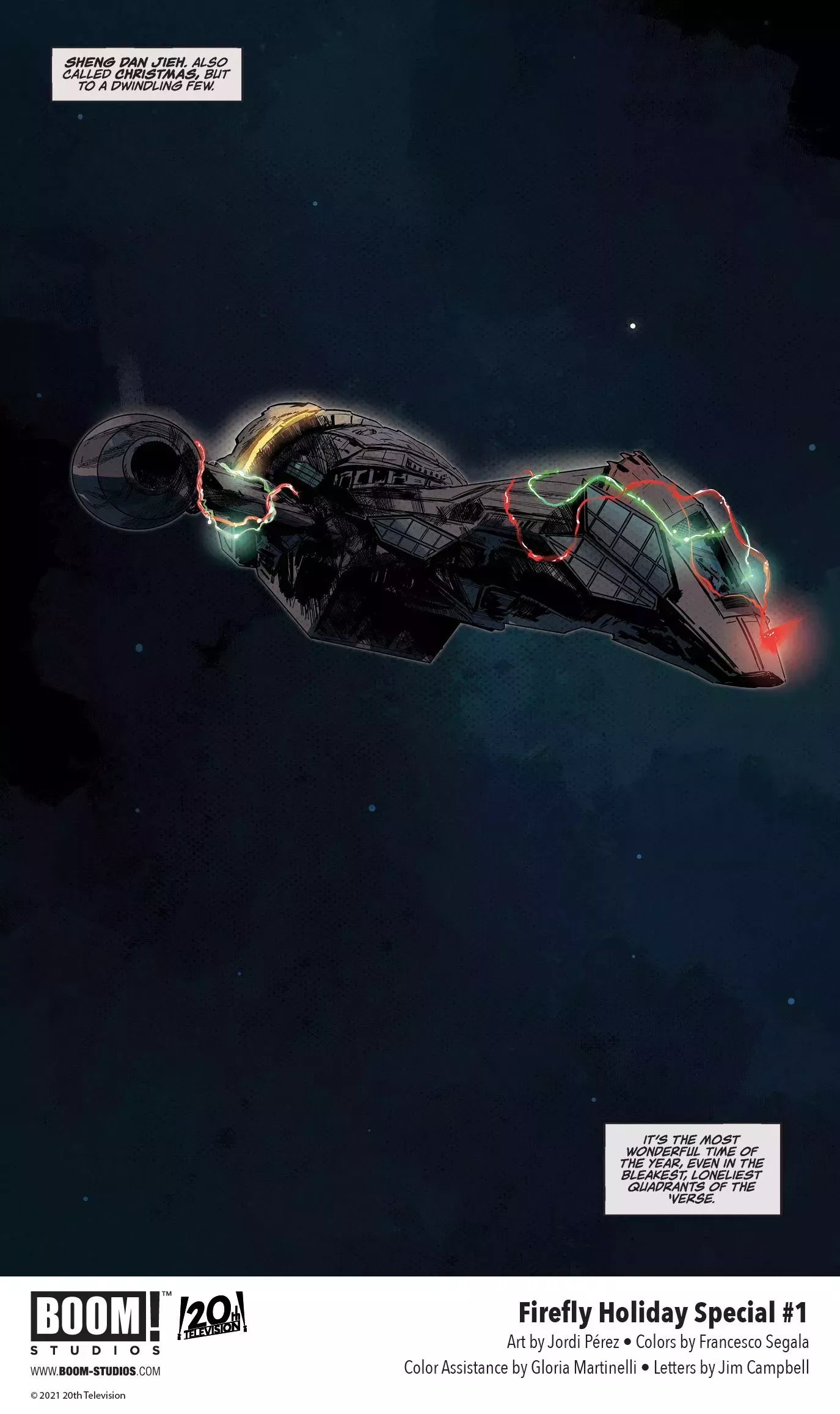 The Firefly Holiday Special #1 es un número único de gran tamaño escrito por Jeff Jensen, ganador de los premios Emmy y Eisner, y por los artistas Vincenzo Federici, Jordi Pérez y Fabiana Mascolo. Francesco Segala es el colorista, con la ayuda de Gloria Martinelli y Lucia Di Giammarino. Jim Campbell se encarga de las letras. El número cuenta con una portada principal de InHyuk Lee y una portada variante de Caitlin Yarsky y Daniel Warren Johnson.