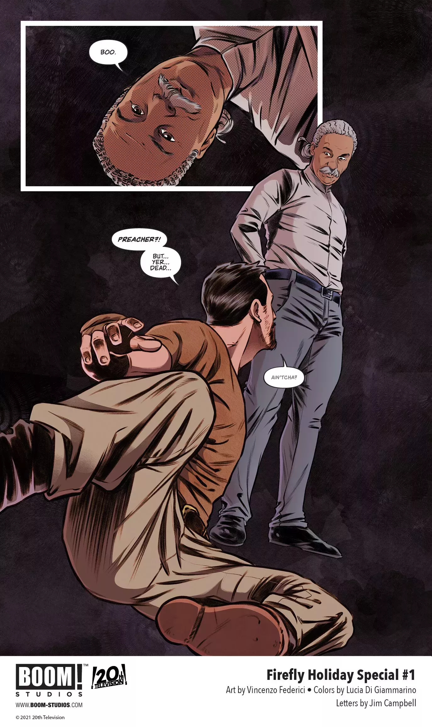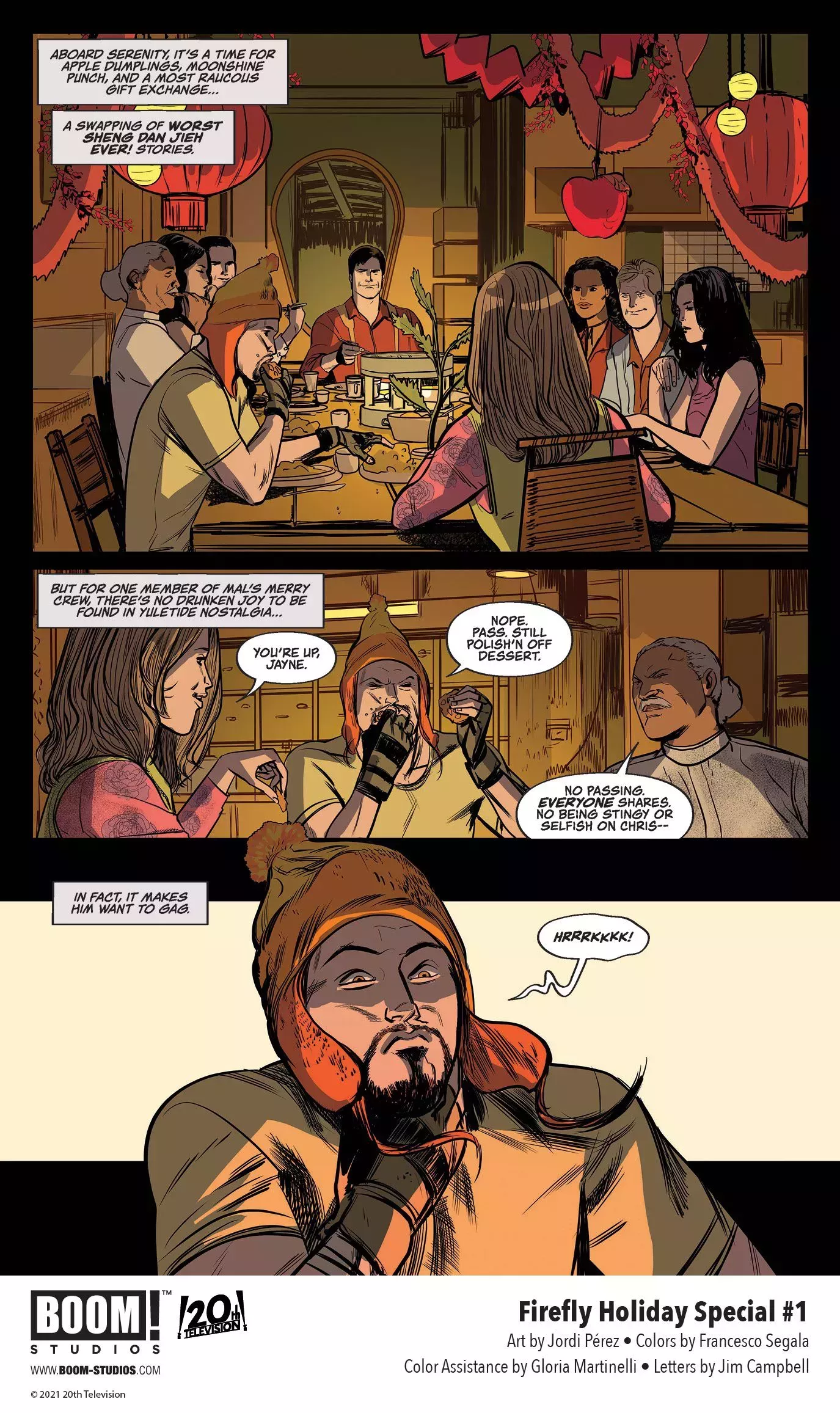 El fantasma del pasado de Firefly parece ser Shepherd Book, el sabio sacerdote que viajó en Serenity durante la serie de televisión original de Firefly pero que fue asesinado en la secuela cinematográfica, Serenity. Si Jayne aprenderá una importante lección sobre el verdadero significado de la Navidad seguramente se revelará en las próximas páginas, pero por ahora, los lectores también pueden ver un flashback de su juventud - donde está vestido con un sombrero con una extraña similitud con el que su madre famosamente le envía por correo en su edad adulta.
