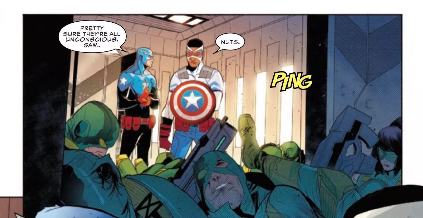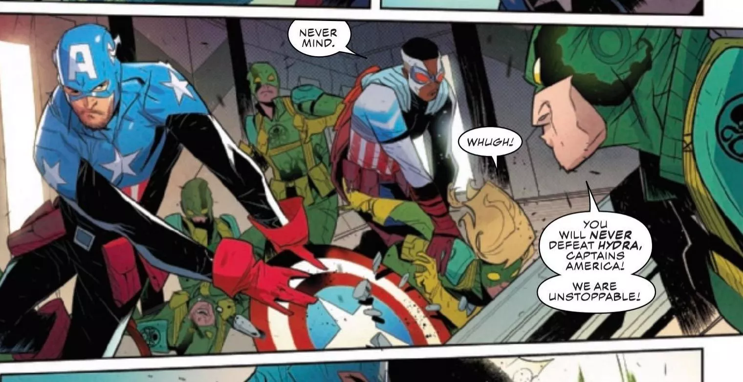 Y aunque ninguno de ellos tiene el escudo de vibranium rojo, blanco y azul de la firma del Cap., lo consiguen más adelante en el número. Este escudo tampoco es el verdadero, sino que es una réplica a prueba de balas hecha por Hydra para lo natural. Sin embargo, como Junior es tan fanático del Capitán América como sus padres, presta su réplica al dúo cuando un ejército de soldados de Hydra aparece para detenerlos. Como resultado, Bucky Cap y el Capitán América de Sam Wilson se lanzan a la batalla contra Hydra, compartiendo un escudo en una batalla épica.