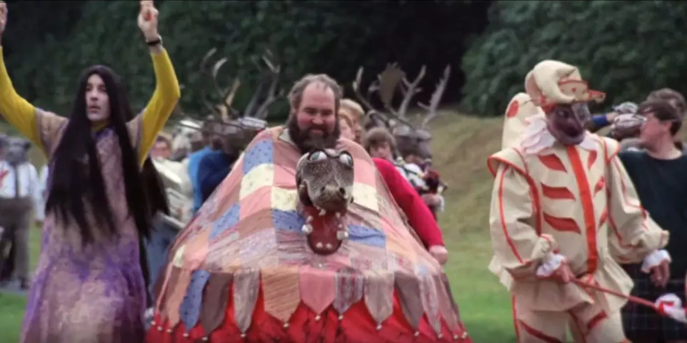 Shaffer recurre a numerosos arquetipos folclóricos para reunir esas cualidades para la película. El diálogo hace referencia directa a Punch, una figura que procede del carnaval italiano y de las tradiciones teatrales, y que no tiene ninguna relación real con las festividades paganas del Primero de Mayo. Sin embargo, los tontos son arquetipos poderosos en los mitos culturales de todo el mundo. Si los cineastas querían una trinidad propiamente dicha, añadir un tonto al teaser y al 'Obby 'Oss es una elección natural y creíble.