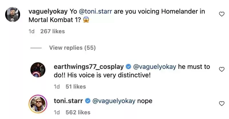 Sin embargo, ahora ha desmentido los rumores sobre su participación. La semana pasada, Starr compartió un puñado de fotos BTS de The Boys en Instagram con un fan comentando "Yo Antony Starr, ¿estás doblando Homelander en Mortal Kombat 1?" y otro añadiendo: "¡Debe hacerlo! Su voz es muy distintiva!". Sin embargo, Starr respondió a ambos con un directo "no".