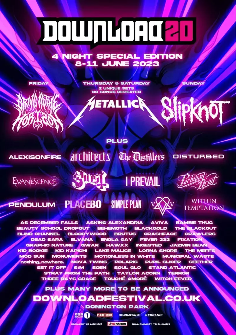 A principios de esta semana, Download anunció que el evento de 2023 estaría encabezado por Slipknot, Bring Me The Horizon y Metallica, que tocarían dos sets completamente diferentes en dos noches distintas. También se confirmó la presencia de Ghost, Evanescence, The Distillers, Placebo y Architects en Donington Park junto con otros 50 artistas.