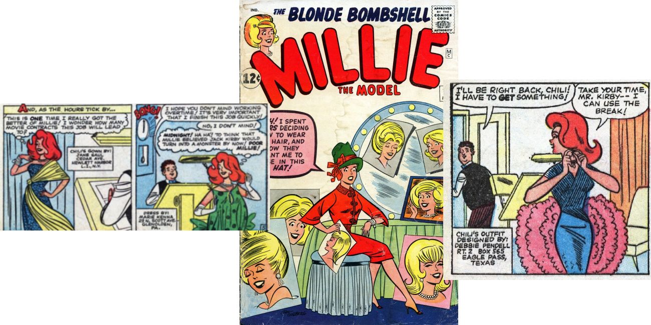 Millie The Model fue el título de humor más largo, publicado por primera vez por Timely Comics durante la transición de la compañía a Atlas Comics y finalmente a Marvel Comics. La serie tuvo 207 números fue una mirada humorística a Millie Collins, un libro de carrera que vivió y modeló en la ciudad de Nueva York la modelo Millie Collins. El número 107, en el que aparece Kirby, fue escrito por Stan Lee e ilustrado por Stan Goldberg, donde Millie posaba para una historia de monstruos que Jack Kirby está haciendo.