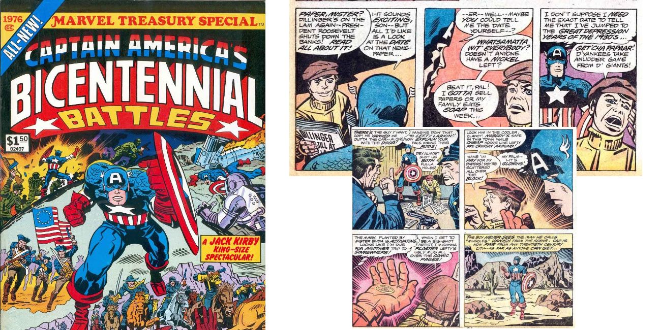 En 1976, como parte de la celebración del bicentenario de los Estados Unidos, Marvel publicó Captain America's Bicentennial Battles Vol 1. Esta edición especial del tamaño de un tesoro fue escrita y dibujada por Jack Kirby, quien, junto con Joe Simon, creó el Icono de Marvel.