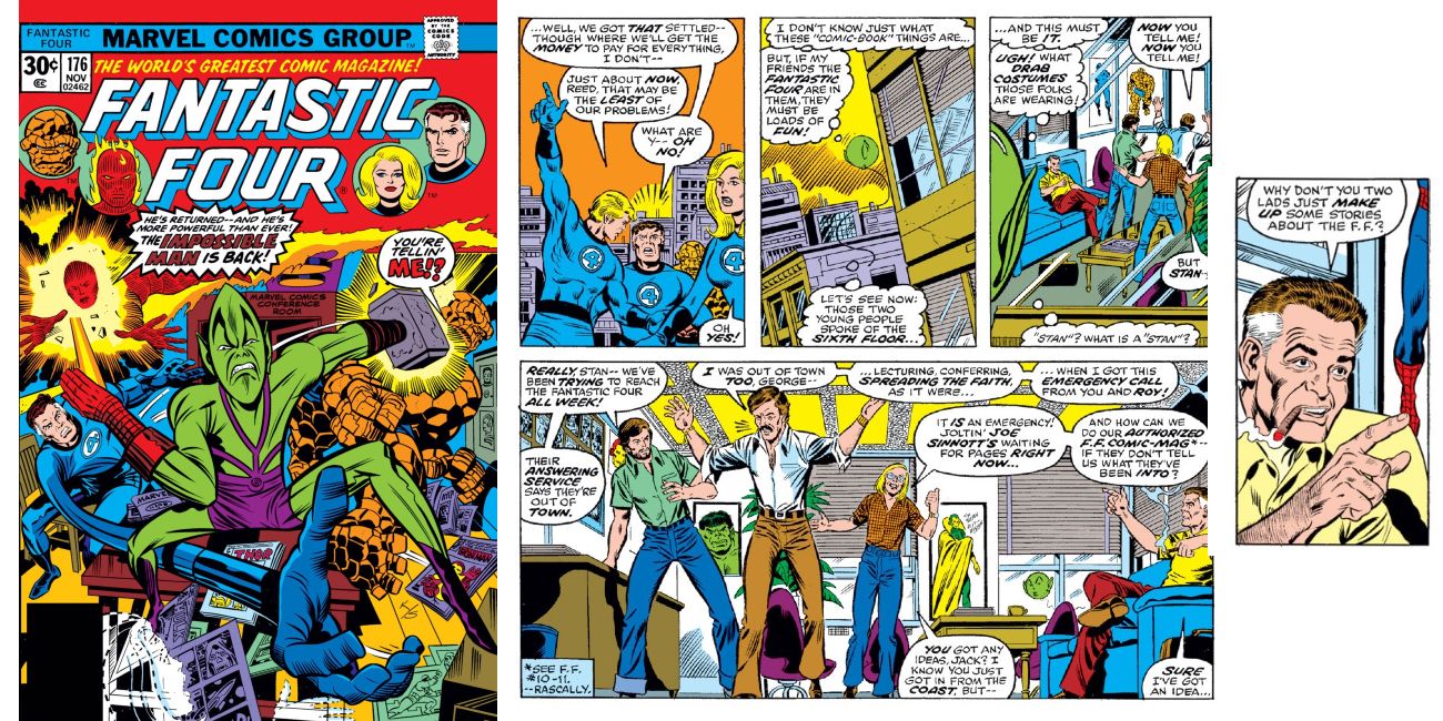 Fantastic Four # 176 "Improbable as it may seem--The Impossible Man Is Back In Town!" no sólo regresó el Hombre Imposible, sino también Jack Kirby, Stan Lee, y otros miembros del Marvel Bullpen. Cuando el Hombre Imposible pierde el interés por los Cuatro Fantásticos, resulta que mira en la ventana de la oficina de Marvel Comics. En el interior, Stan Lee está estresado porque no han sido capaces de conseguir los Cuatro Fantásticos durante semanas, y la fecha límite para la próxima edición se acerca.