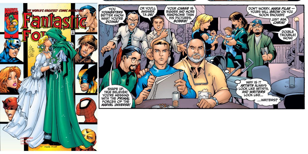 El equipo creativo actual de la serie, el escritor Chris Claremont, el dibujante Salvador Larroca y el dibujante Art Thibert, se ha colado en la boda. Mientras los tres están sentados en la mesa, Stan y Jack se muestran corriendo exigiendo que sepan mejor lo que están haciendo o tendrán que responder ante ellos.