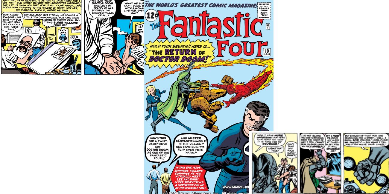 Los Cuatro Fantásticos #10 fue la primera de muchas apariciones que tanto Stan Lee como Kirby harían en el Universo Marvel. En esta edición, la tercera aparición del Doctor Doom encuentra al malvado villano regresando de estar perdido en el espacio, apareciendo en el Marvel Bullpen, donde Lee y Kirby tratan de encontrar un villano para el FF.