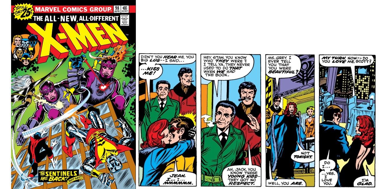 En "Uncanny X-Men #98", los felices mutantes de Marvel están en Times Square durante la temporada de vacaciones para hacer turismo y pasar un tiempo libre. Buscando un tiempo a solas, Scott Summers y Jean Grey entran en un restaurante, y Jean besa a Scott. Sin que los dos mutantes lo sepan, Jack Kirby y Stan Lee también están en el mismo restaurante y ven la demostración pública de afecto de los dos. Jack rompe la cuarta pared y le comenta a Stan que los dos nunca se besaron cuando estaban en el libro. Stan está de acuerdo, diciendo que "los chicos de hoy en día no tienen respeto". Momentos después, los centinelas atacan a la pareja y los lectores asumen que tanto Jack como Stan salieron ilesos en la carnicería que siguió.