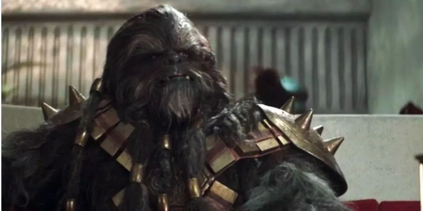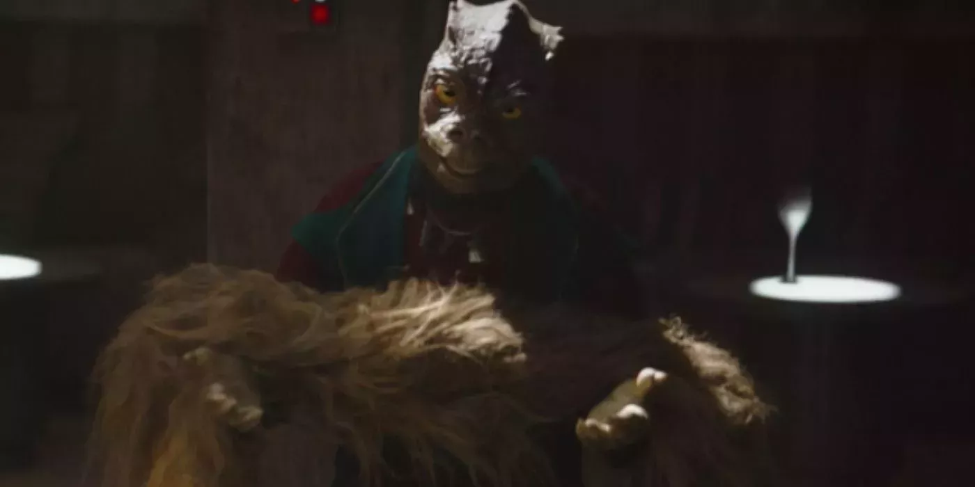 Durante la escena, Black Krrsantan está sentado en una mesa cuando ve a un grupo de trandoshanos al otro lado de la sala. Están jugando, riendo y, en general, ocupándose de sus propios asuntos, pero Black Krrsantan ya ha oído suficiente. Con sus nudillos de metal, el cazarrecompensas wookiee ataca brutalmente al grupo e incluso le arranca el brazo a un trandoshano. ¿Pero por qué?