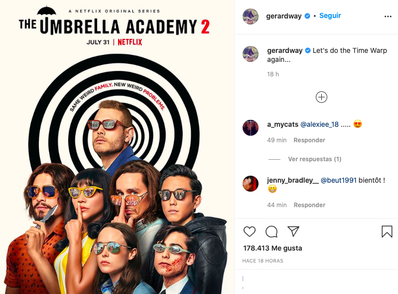 Gerard Way ha compartido un nuevo póster que se burla de la segunda serie de La Academia Paraguas, la serie Netflix basada en las novelas gráficas del líder de Mi Romance Químico. Way compartió una imagen del elenco central de la serie con gafas de sol delante de una espiral en blanco y negro, con la leyenda: "Hagamos de nuevo la Guerra del Tiempo..." Los nuevos episodios llegarán a Netflix el 31 de julio.