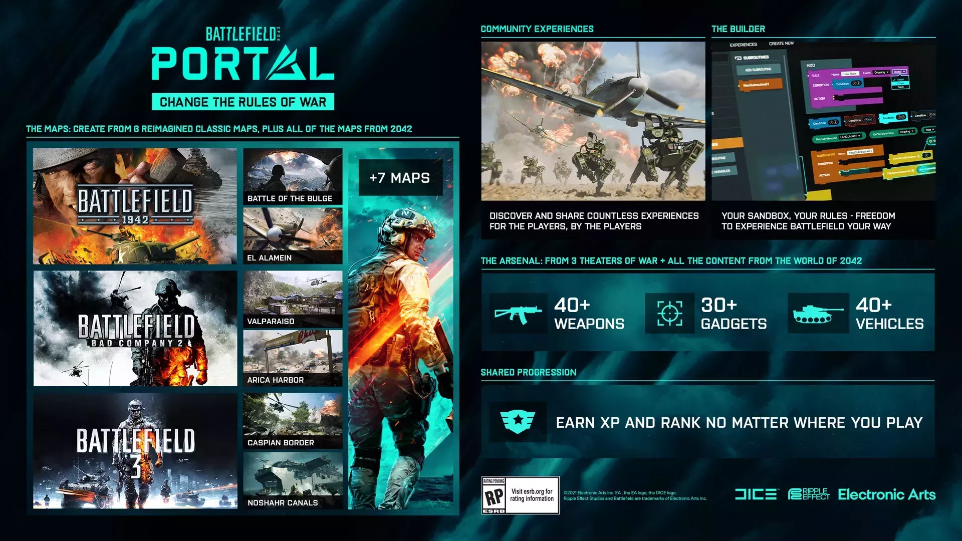 Battlefield Portal ofrece contenidos de Battlefield 1942, Battlefield: Bad Company 2, Battlefield 3, así como contenidos de lanzamiento y futuros de Battlefield 2042, y permite a los jugadores mezclarlos en listas de juego personalizadas. Los creadores pueden personalizar casi todos los aspectos de una partida, incluyendo cuántos jugadores hay en el servidor, de qué juego son los jugadores de los equipos, qué armas y vehículos pueden usar los jugadores y qué modo experimentarán los jugadores. En otras palabras, puedes hacer que la Wehrmacht de 1942 se enfrente a la facción rusa de Battlefield 3o a los nuevos Especialistas No-Pat de Battlefield 2042.