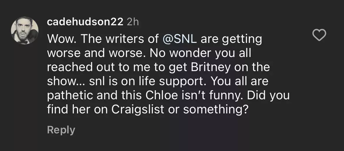 "Wow. Los guionistas de SNL están cada vez peor. No es de extrañar que me pidieran que llevara a Britney al programa... SNL está con respiración asistida", escribió Hudson.