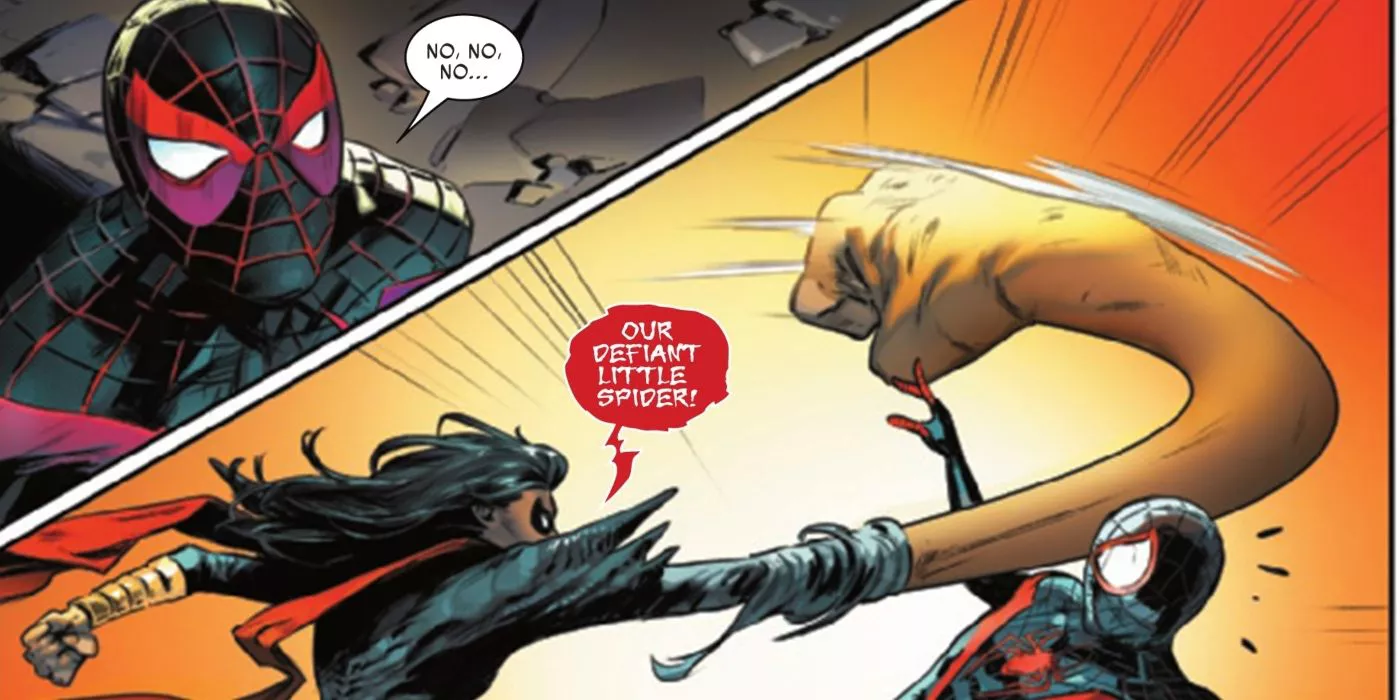 Sin embargo, no se puede decir lo mismo de Miles, a quien Kamala encuentra inconsciente en el suelo, todavÃa ardiendo por la potencia de la explosión. Parece que el esfuerzo por desatar una explosión tan poderosa también le hizo mucho daño. Aunque Miles fue capaz de salvar a una joven y poderosa heroÃna y hacer que volviera a la lucha, también podrÃa haberle apartado de la batalla en el proceso. Es el tipo de sacrificio que Miles estarÃa dispuesto a hacer en cualquier circunstancia por sus amigos, pero sigue siendo desgarrador ver que realmente tiene que hacerlo. Ms. Marvel también puede ser ahora la única que puede mantener a Miles con vida, con la compañera Campeona fundadora prometiendo velar por él a pesar del caos que estalla a su alrededor.