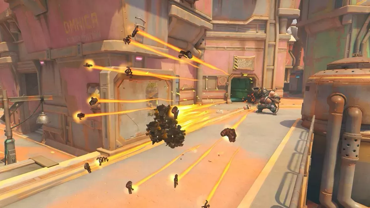 La pistola de chatarra de Roadhog se está simplificando y se ha eliminado por completo su disparo secundario explosivo. En su lugar, Blizzard combina sus dos métodos de disparo en uno: Su ráfaga de escopeta incluye ahora una salva de metralla de cuatro proyectiles grandes en el centro de su disparo, además de un chorro de perdigones.