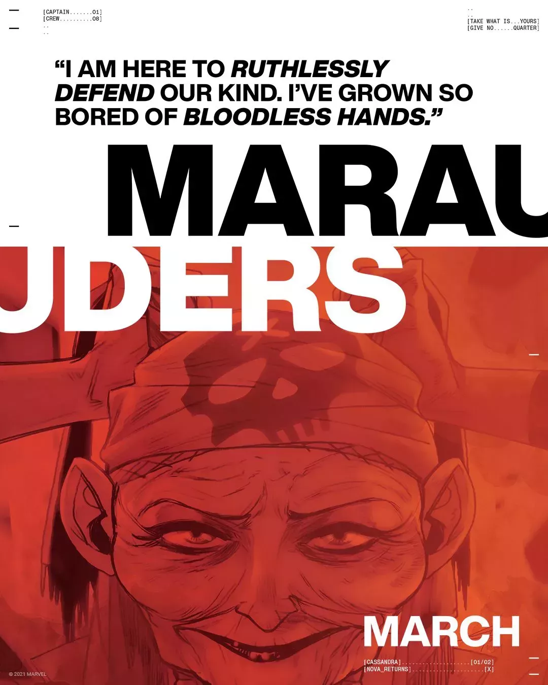 Nova no es el único miembro nuevo de la tripulación de los Merodeadores. Cuando la Reina Roja Kate Pryde y Red Bishop abandonen la BahÃa del Fuego Infernal, Aurora, Psylocke, Daken, Somnus y Tempo, el perdedor de los votos de los fans de X-Men, se unirán a ellos. Juntos, el equipo buscará mutantes en peligro de extinción y los llevará de vuelta a las costas de Krakoa. Su primera misión se desarrollará en el Marauders Annual #1 de enero, en el que se cruzarán con Brimstone Love, de X-Men 2099, cuya llegada plantea preguntas sobre la escala de la misión del equipo.