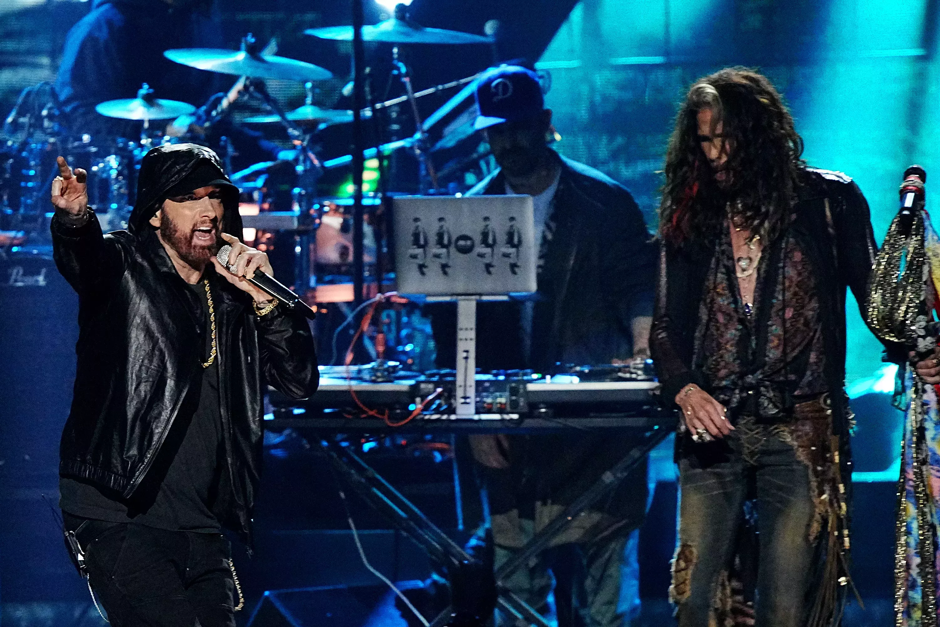 Aunque la última vez que estuvo de gira fue hace cuatro años, los conciertos de Eminem han sido algo bastante raro en la última década, y su electrizante actuación en el escenario del Rock Hall hace que uno mueva la cabeza y se pregunte por qué alguien que puede iluminar un escenario así no lo hace más a menudo. Tras el discurso de presentación de Dr. Dre, que continuó con el tema de la tolerancia y la paz señalando que este rapero pionero de raza blanca "nos obligó a enfrentarnos a nuestros propios prejuicios", Eminem subió al escenario en torno a las cuatro horas y media de la velada. Inmediatamente puso en pie al cansado público con una mezcla de "My Name Is", "Rap God" -con sus versos casi imposiblemente rápidos-, "Sing for the Moment" -con la participación de un nuevo cantante blanco- y "The Row".con la participación de un Steven Tyler recién rehabilitado, "Stan" -con Ed Sheeran cantando el segmento originalmente cantado por Dido y posteriormente por Elton John-, "Forever" y "Not Afraid"."Además, culminó su amable y agradecido discurso de aceptación hablando en términos típicamente francos de su propia recuperación del abuso de sustancias, y luego leyendo una lista alfabética de aproximadamente 50 de los raperos que lo influenciaron, desde 2 Live Crew hasta X-Clan.