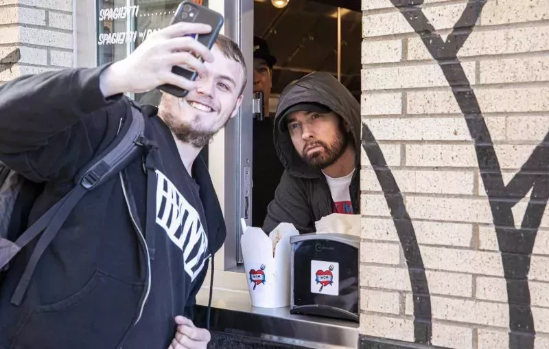 Eminem atendió la ventanilla de Mom's Spaghetti durante un breve periodo de tiempo ayer para celebrar su apertura, con el rapero sirviendo comida y haciéndose fotos con los 10 primeros clientes de la cola.