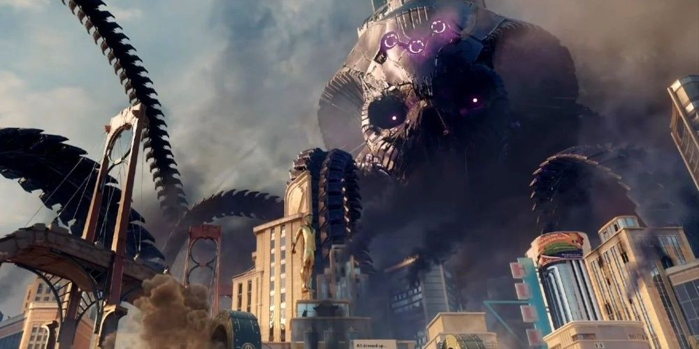 Hablando de Metrópolis, la ciudad parece tener un colosal golpe de barco en forma de cráneo en medio de ella, con caos, violencia y seres parecidos a los zombis rodeándola.