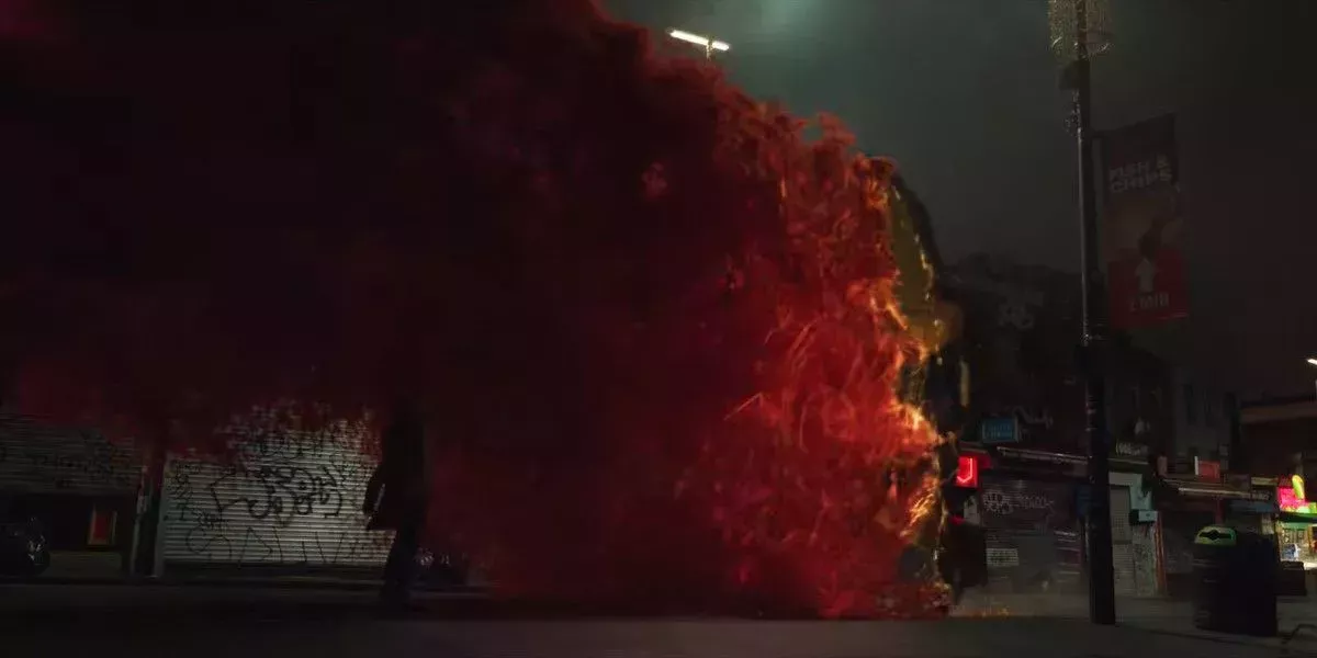 El original ataque de los desviados en Londres está lleno de sorpresas. Sersi, Sprite y el novio humano de Sersi, Dane Whitman (Kit Harington), son emboscados por Kro. Sprite intenta cubrir su retirada, pero sólo tiene un éxito limitado. Ikaris aparece y ahuyenta al desviado, pero Sersi se lleva posiblemente el mejor momento de la escena. Cuando un autobús londinense casi la atropella, ella lo transforma en una lluvia de pétalos de rosa. Está muy bien hecho y las imágenes también enfatizan el carácter más amable y gentil de Sersi.