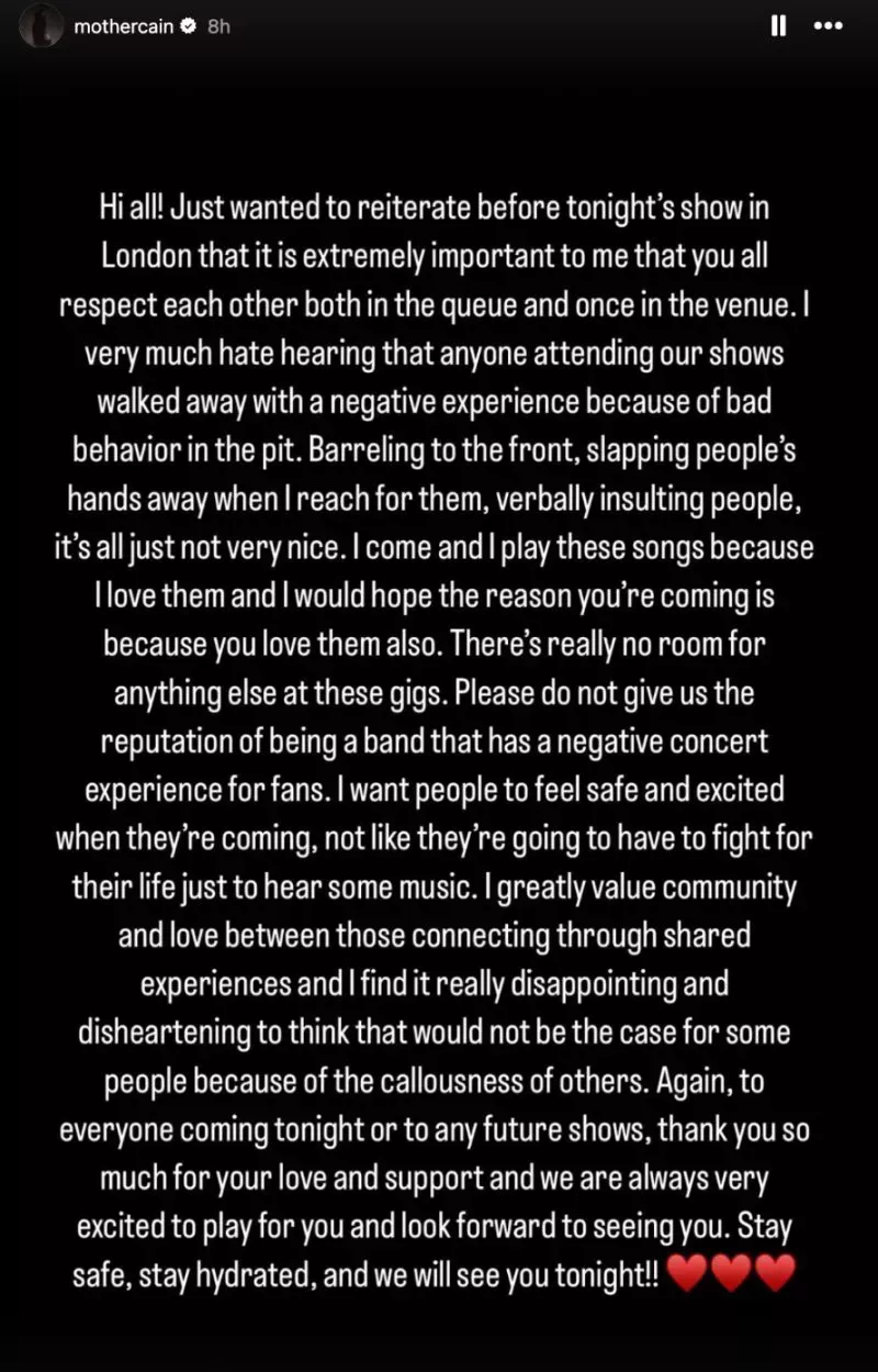 Antes del concierto de ayer en Londres, Cain compartió un comunicado en su Instagram Stories en el que recordaba a los asistentes al concierto la etiqueta y cómo tratarse entre el público.