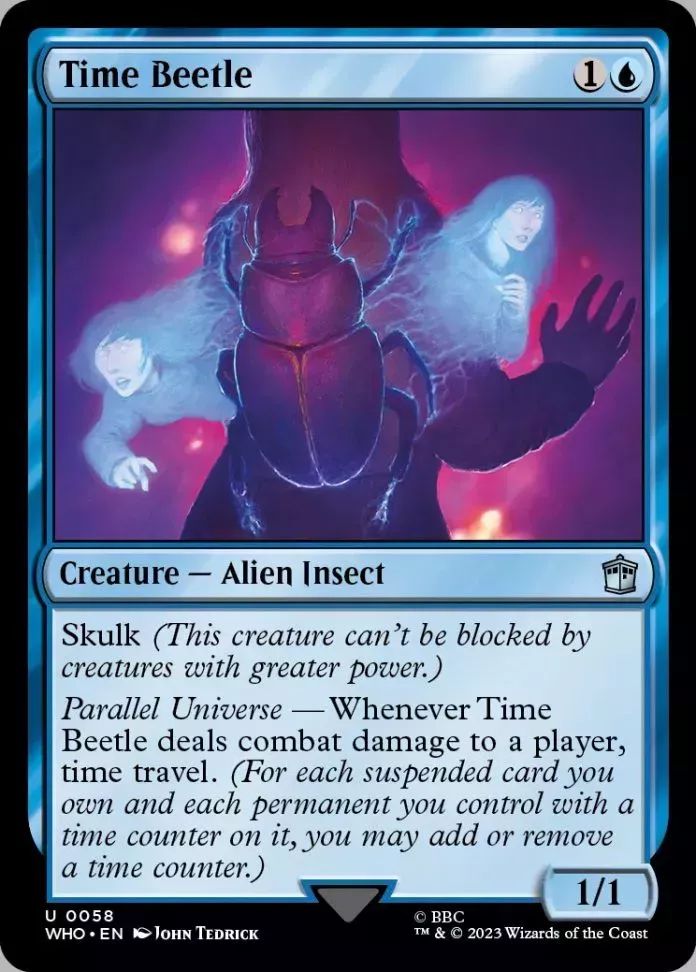 En su diseño, el "Escarabajo del Tiempo" representa la lÃnea temporal alternativa si Donna Noble nunca hubiera conocido al Doctor. Sus rasgos son Esconderse, lo que significa que las criaturas más poderosas no pueden bloquear a esta criatura, y Universo paralelo. Cuando se inflige daño de combate a un jugador a través de la criatura Escarabajo del tiempo, esta carta puede viajar en el tiempo.