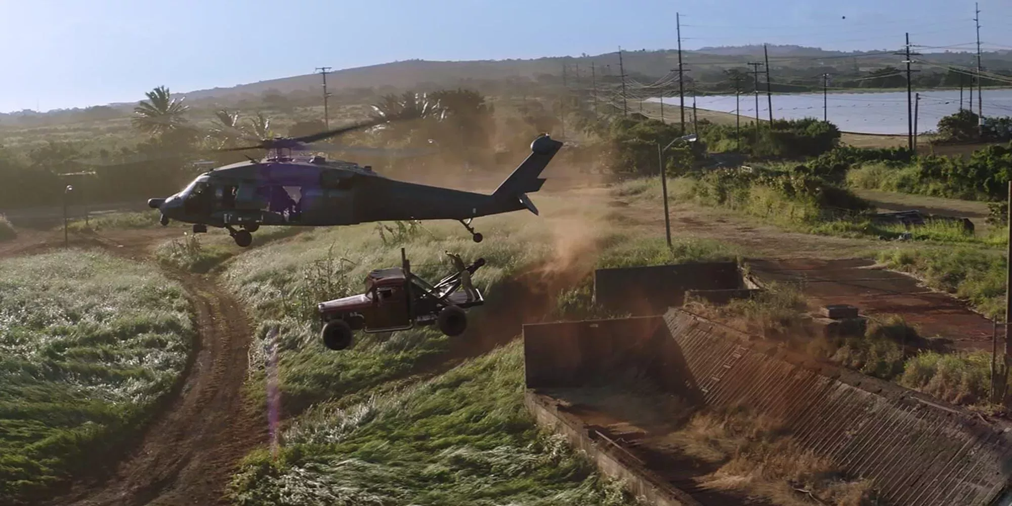 Sacando el MacGyver que llevan dentro, Hobbs y Shaw utilizan un camión y una cadena de alta resistencia para derribar el helicóptero de Brixton Lore. Al poco tiempo, la familia samoana de Hobbs acude a ayudar en el atraco, enlazando otros camiones para contrarrestar el helicóptero, lo que desencadena un tira y afloja entre quedarse en el suelo o subir al cielo.