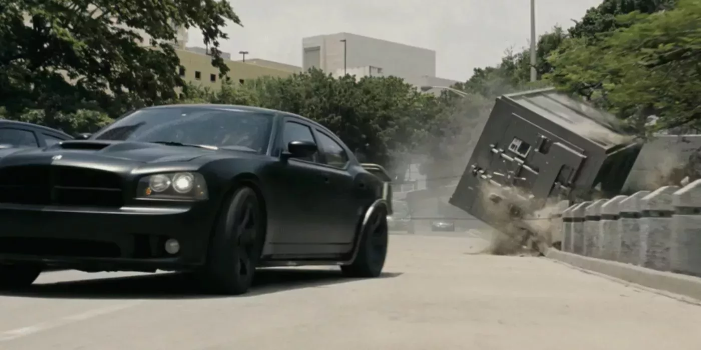 En uno de los atracos más ridículamente excesivos de la franquicia, Dom y Brian irrumpen en una comisaría, roban una cámara acorazada y la arrastran por las calles de Río de Janeiro detrás de sus Dodge Chargers.