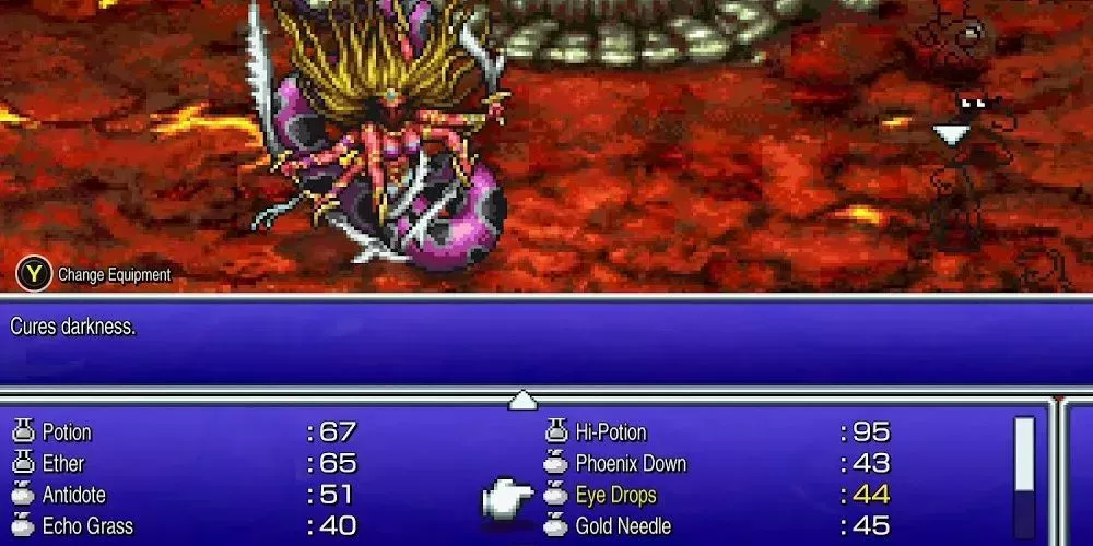 En las primeras versiones del juego, los enemigos podÃan lanzar el estado ceguera/oscuridad. Esta molesta habilidad dificultaba a los jugadores la selección de un enemigo para atacar y podÃa provocar daños en uno mismo. Un mago podÃa curar fácilmente esta dolencia, pero cuando se jugaba sin grupo, las gotas para los ojos hacÃan el trabajo. El objeto mágico curaba la ceguera y permitÃa a los jugadores volver a luchar. Los jugadores pueden comprar gotas para los ojos por el razonable precio de 40 Gil, que es la forma que tiene el juego de decir "abastécete de ellas".