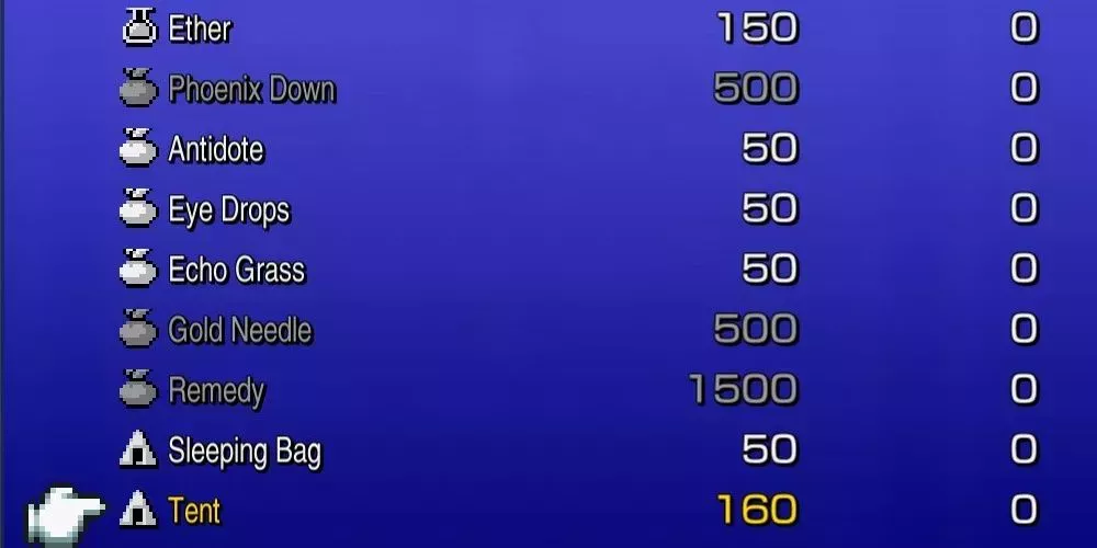 El protagonista de la popular serie de juegos de rol tiene dos importantes barras de poder: HP y MP. MP significa puntos de magia. Los MP permiten al jugador utilizar hechizos/magia para acabar con los enemigos. Al igual que el HP, puedes quedarte sin MP cuanto más hechizos lances. Cuando juegas solo, no hay ningún miembro del equipo que recargue los PM, y es entonces cuando los éteres resultan útiles. Dependiendo del juego, los éteres pueden proporcionar entre 20 y 100 PM. Atención: ¡este útil objeto puede costar hasta 1500 Gil en una tienda de objetos!