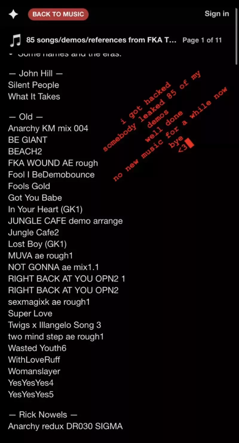 Con la noticia de las filtraciones, sin embargo, el álbum aparentemente no saldrá a la venta. "Bien hecho", escribió FKA twigs en sus historias de Instagram: "no hay nueva música por un tiempo. bye <3". Una segunda historia lo confirmaba con el siguiente texto sobre fondo negro: "no new music <3".