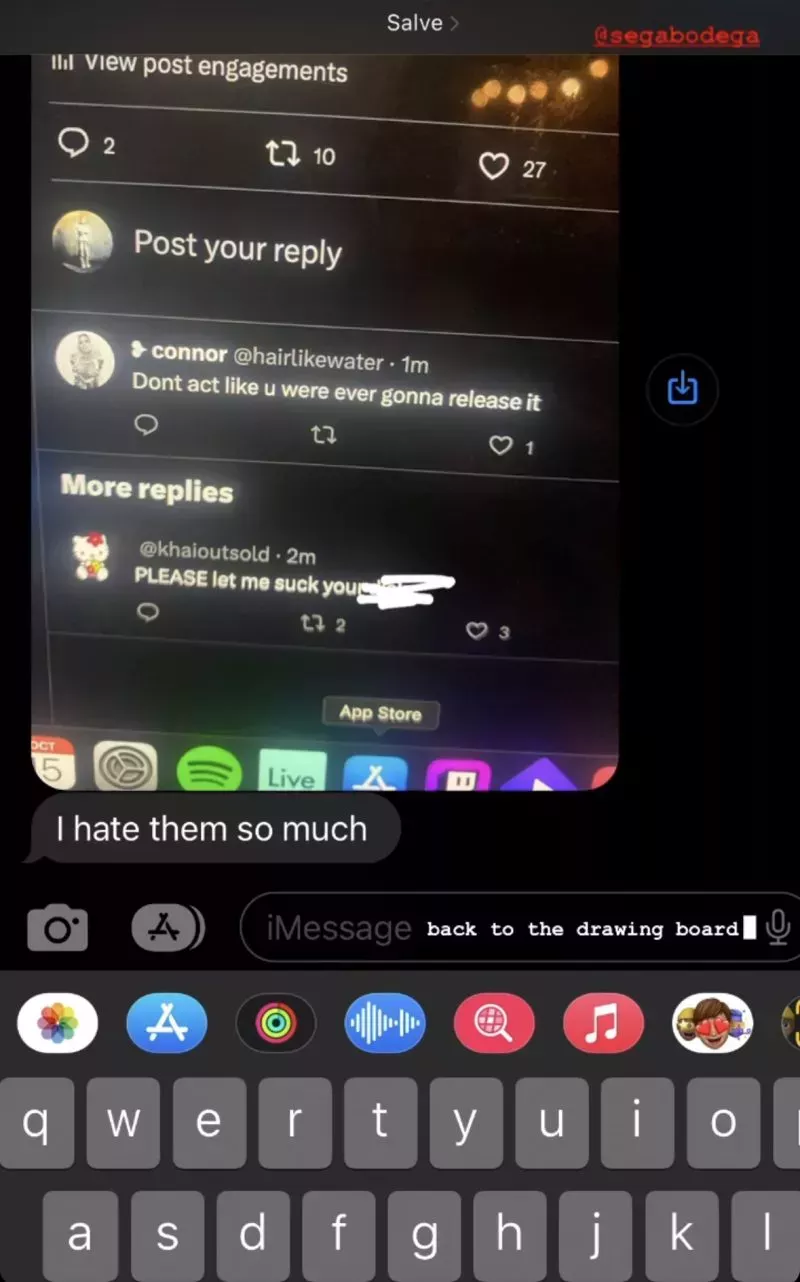 La cantante también compartió una conversación de texto entre ella y el productor Sega Bodega, en la que además escribió: "de vuelta a la mesa de dibujo".