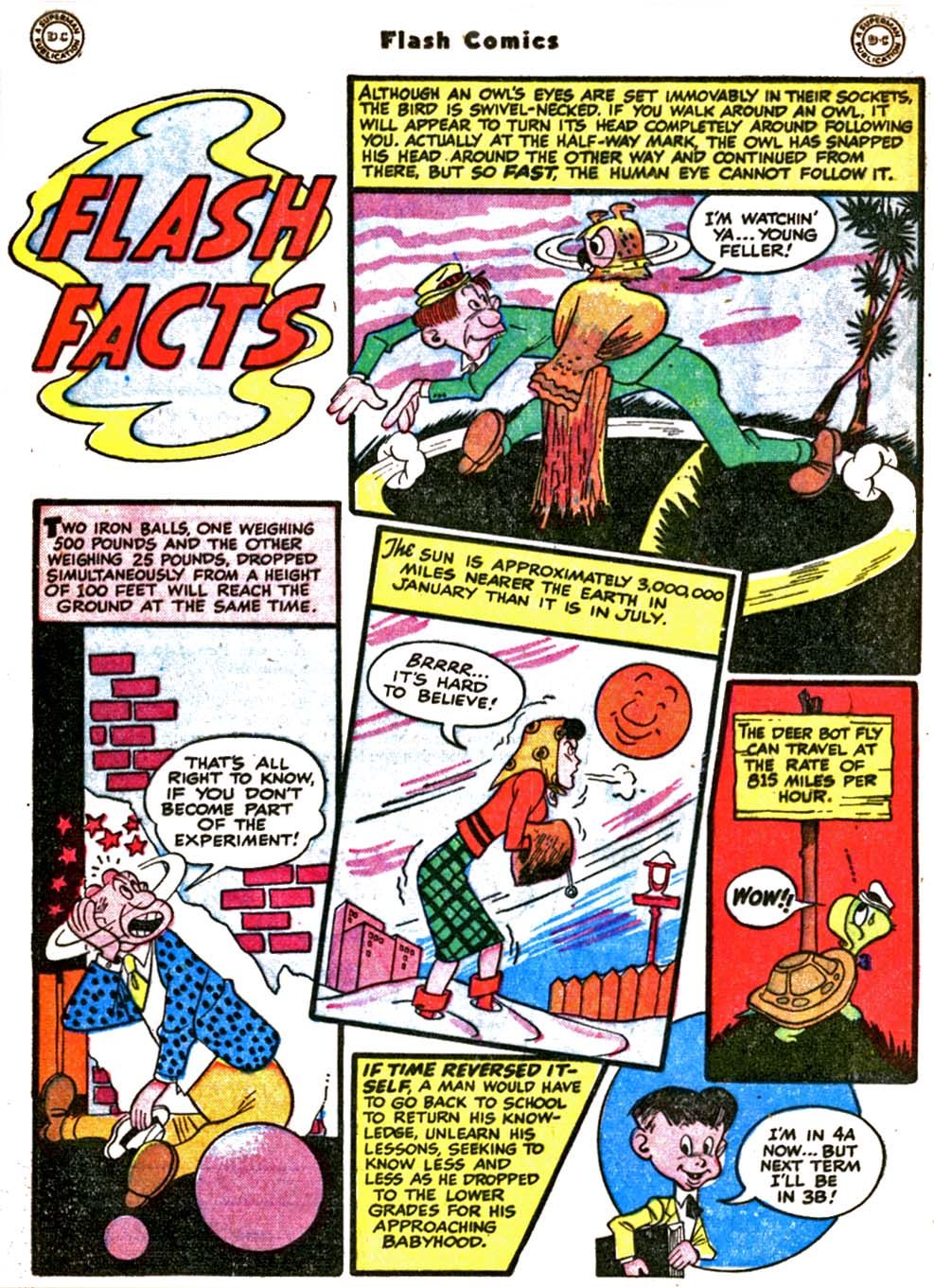A Schwartz le fascinaba la ciencia y por eso, en el número 98 de Flash Comics de 1948, Schwartz estrenó "Flash Facts" como un artículo recurrente que detallaba hechos científicos. De nuevo, Flash Comics seguía siendo una antología (con Hawkman convirtiéndose en un elemento más destacado de la serie una vez que Flash perdió su serie en solitario), así que los primeros "Flash Facts" no tenían nada que ver con la velocidad...