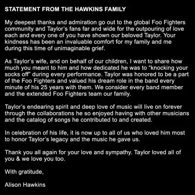 Ella continuó: "Como esposa de Taylor, y en nombre de nuestros hijos, quiero compartir lo mucho que significabas para él y lo dedicado que estaba a 'dejarte boquiabierto' durante cada actuación. Taylor tuvo el honor de formar parte de los Foo Fighters y valoró su papel de ensueño en la banda cada minuto de sus 25 años con ellos. Consideramos a todos los miembros de la banda y al amplio equipo de Foo Fighters como nuestra familia.