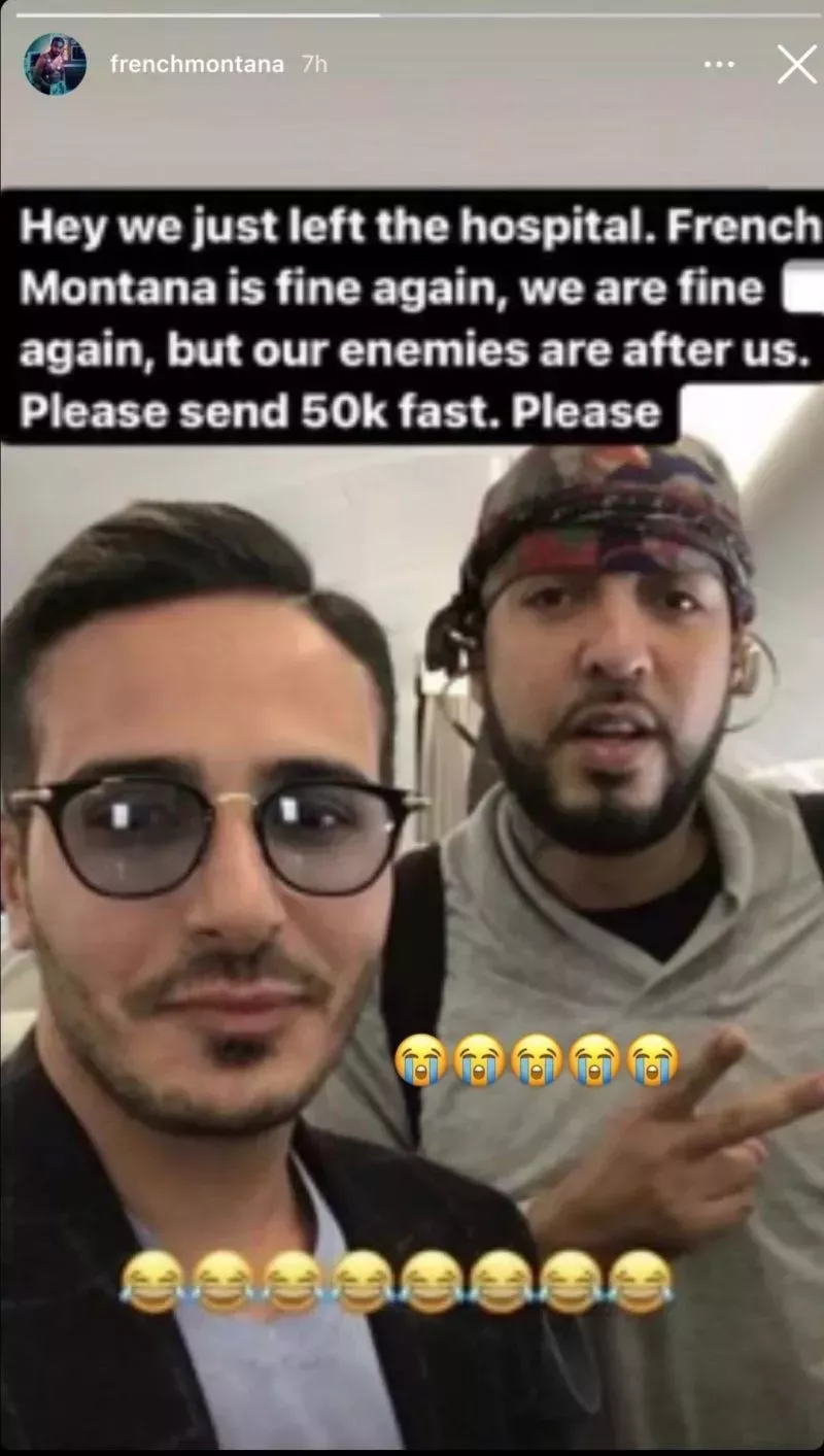 Más tarde volvió a publicar la misma foto con emojis de risa y un nuevo pie de foto: "Oye, acabamos de salir del hospital. French Montana está bien de nuevo, nosotros estamos bien de nuevo, pero nuestros enemigos nos persiguen. Por favor, enviad 50k rápido. Por favor".