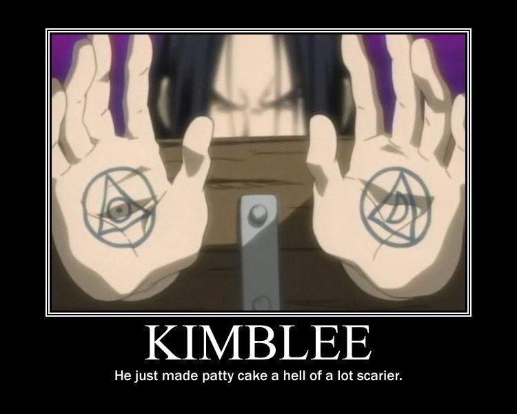 Kimblee no es el tipo que quieres sentado frente a ti, pidiendo jugar un juego de pastelitos. Su comportamiento es inquietante, hayas o no oído hablar de sus payasadas en la injusta guerra con Ishval o de su alegría por ver a la gente volar en pedazos (que es probablemente la adicción más aterradora y extrañamente satisfactoria que puede haber).