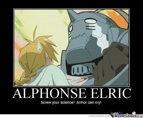 Alphonse Elric suele ser bueno para mantener el ánimo, pero hace saber a todos los que conoce que siente sentimientos, aunque básicamente es un robot.